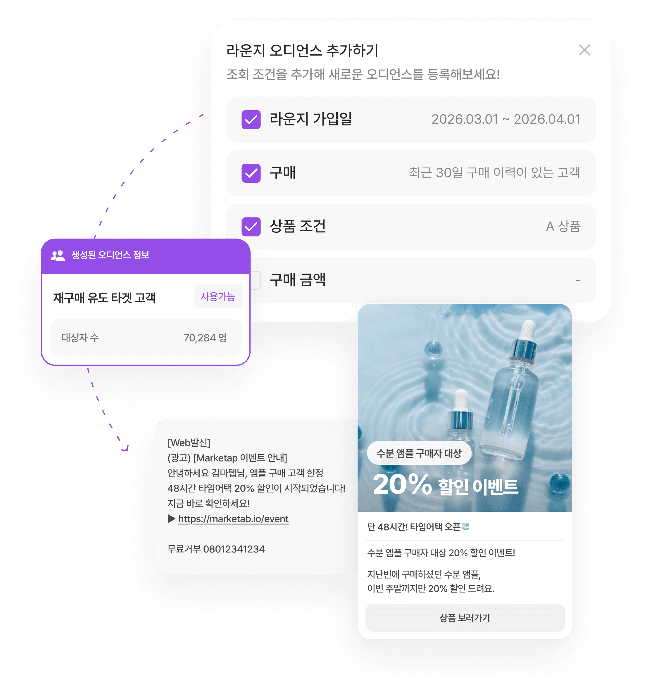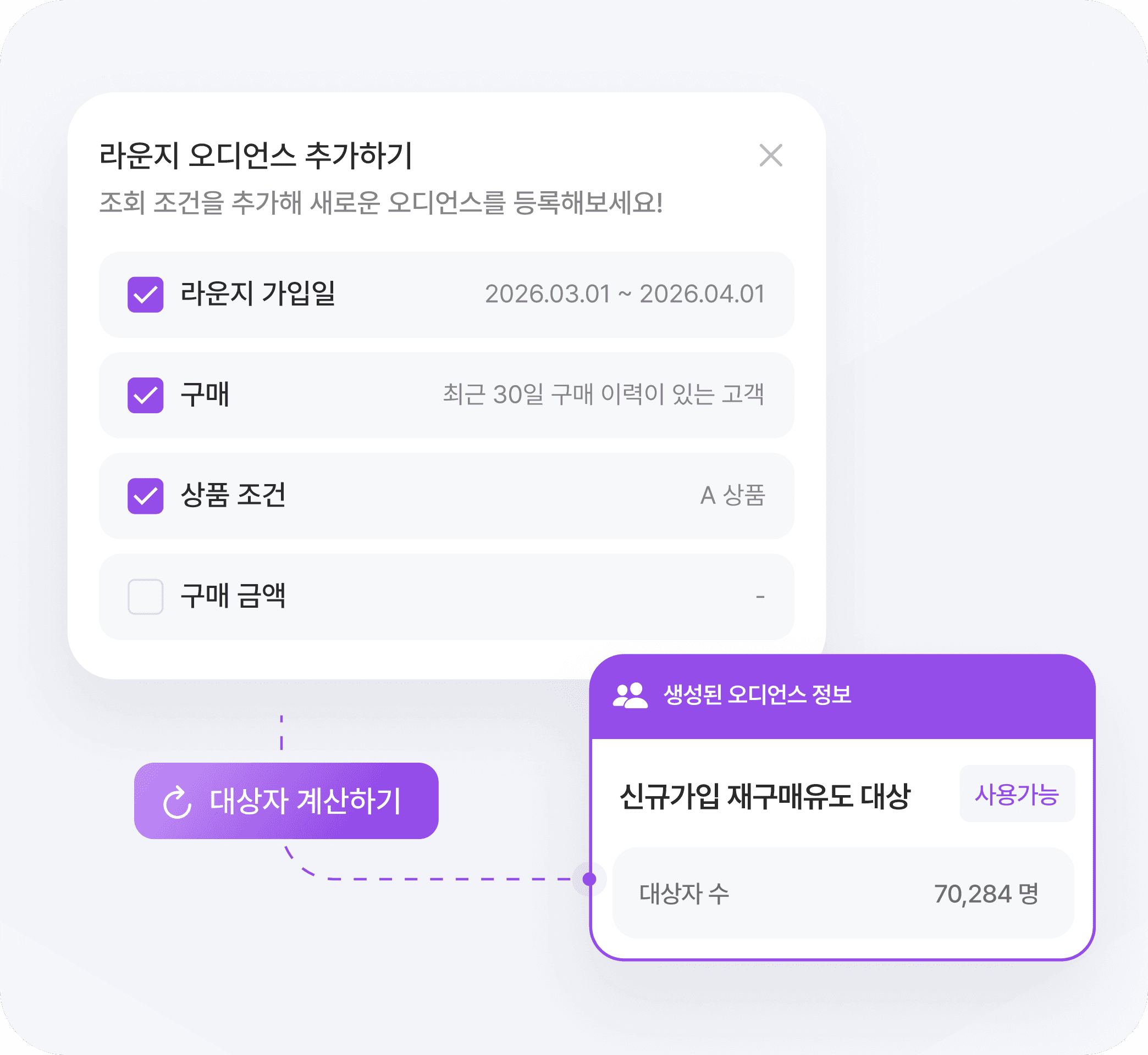 라운지 설문 응답과 구매 이력, 상품 조회, 기간 조건 등 다양한 데이터를 기반으로 고객을 자유롭게 타겟팅할 수 있습니다.