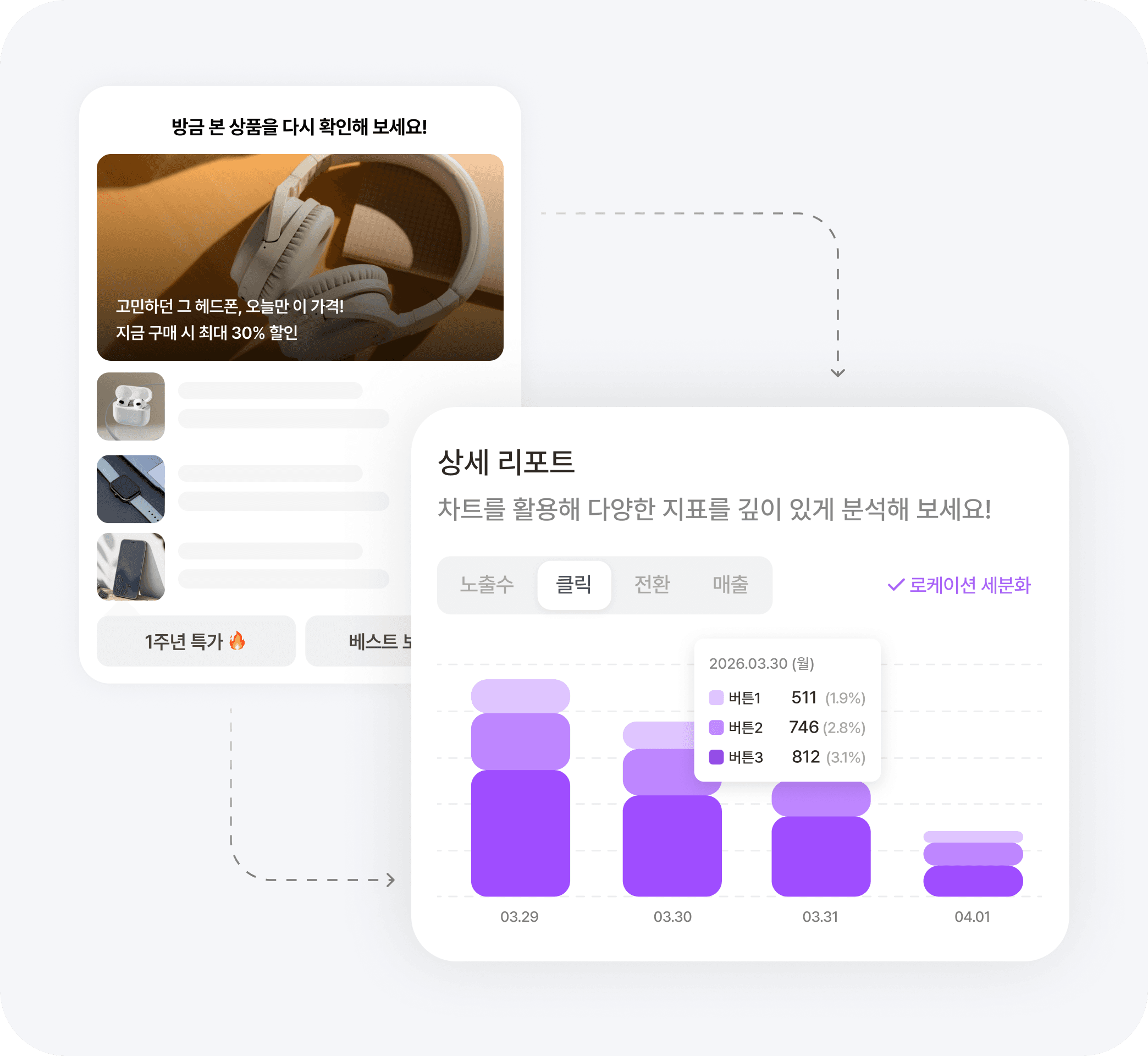 발송부터 매출까지, 캠페인의 모든 지표를 한 화면에서 확인하세요. 일자별 트렌드와 버튼별 클릭률까지 세밀하게 분석할 수 있습니다.